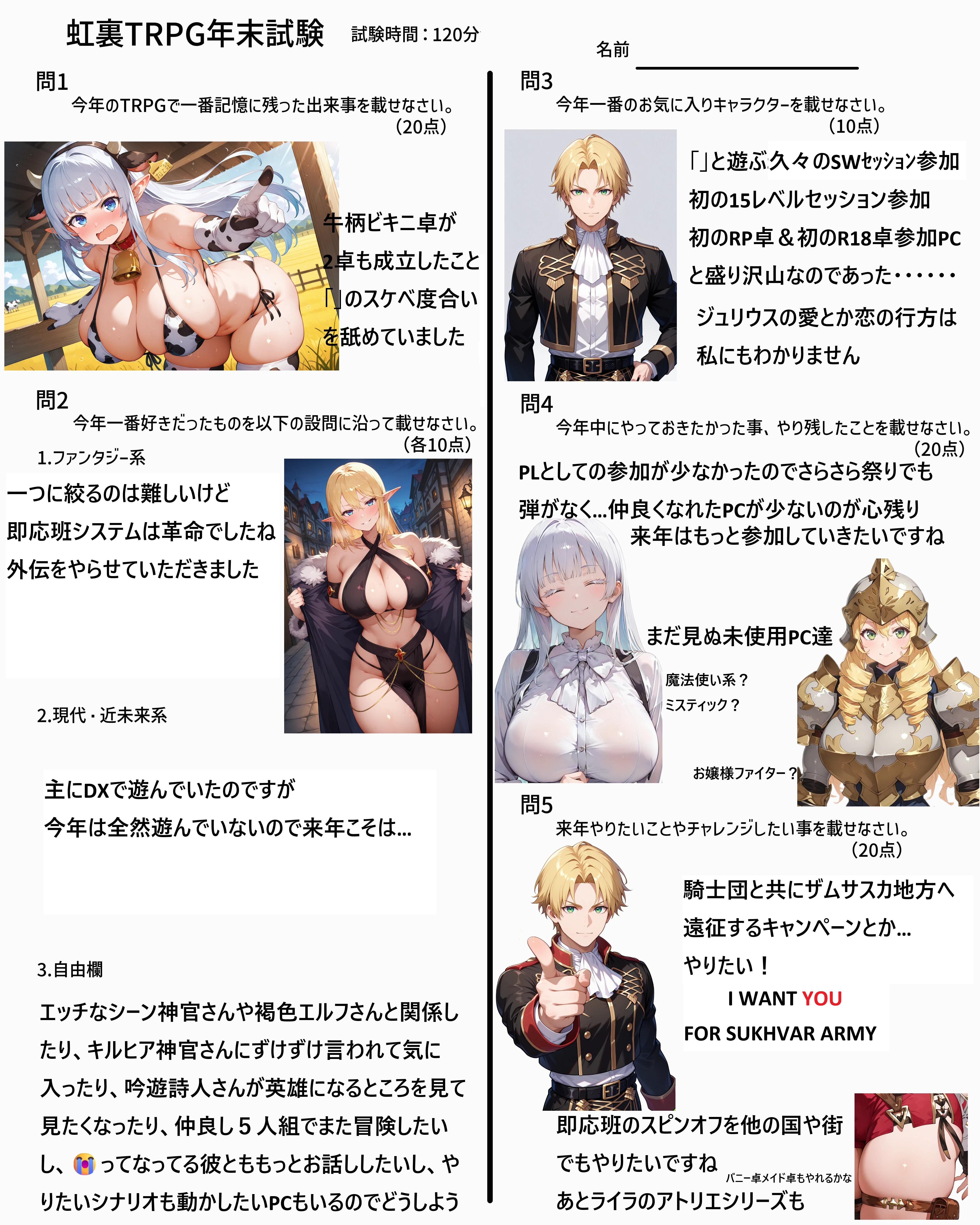 | … | 7125/12/15(月)23:14:03No.1382920768+>とりあえずPC11人分レポート書いたところで今日は終わり…… |