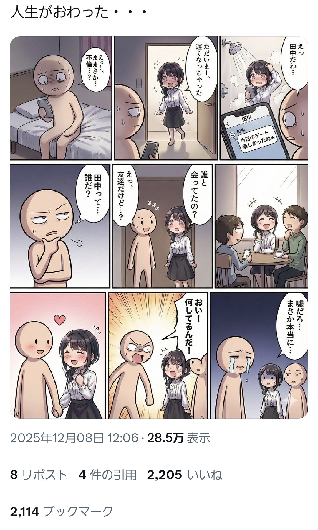 | … | 4525/12/17(水)16:14:05No.1383393520+AIを選んで指示を工夫すれば今ならちゃんと「彼女が浮気してるのが分かって辛い」って分かる漫画作れるよな… |
