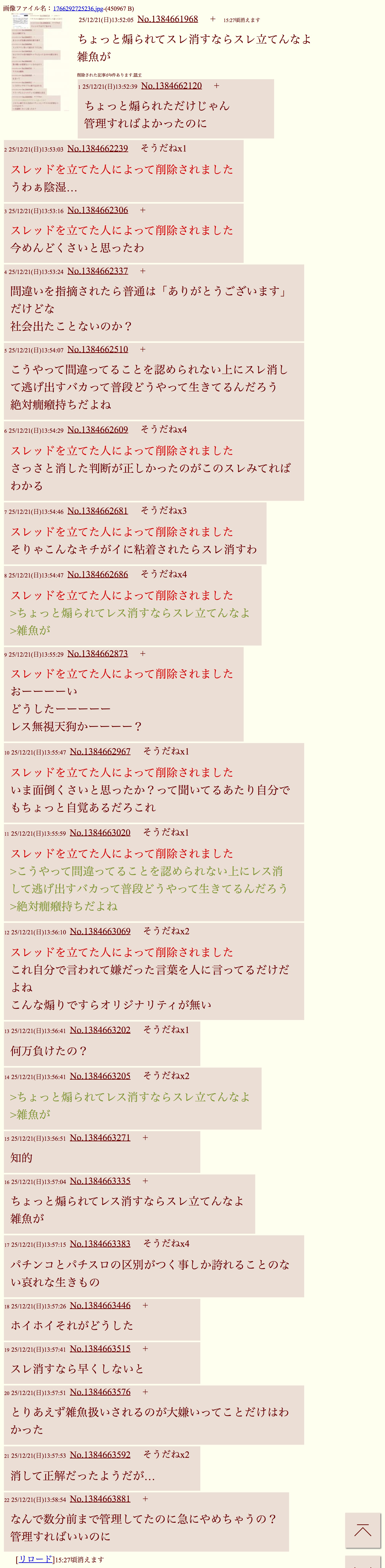 | … | 625/12/21(日)14:09:56No.1384667016+これ自分はちょっとくらい煽られてもスレ消さないってこと?ってレスしたら消しちゃった… |