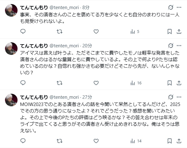 | … | 1825/12/21(日)16:40:53No.1384714775+年末のライブでPたちが判断してくれるよって周知の出来事のように言ってることがまるで意味わからなくて大丈夫か?この人ってなる |