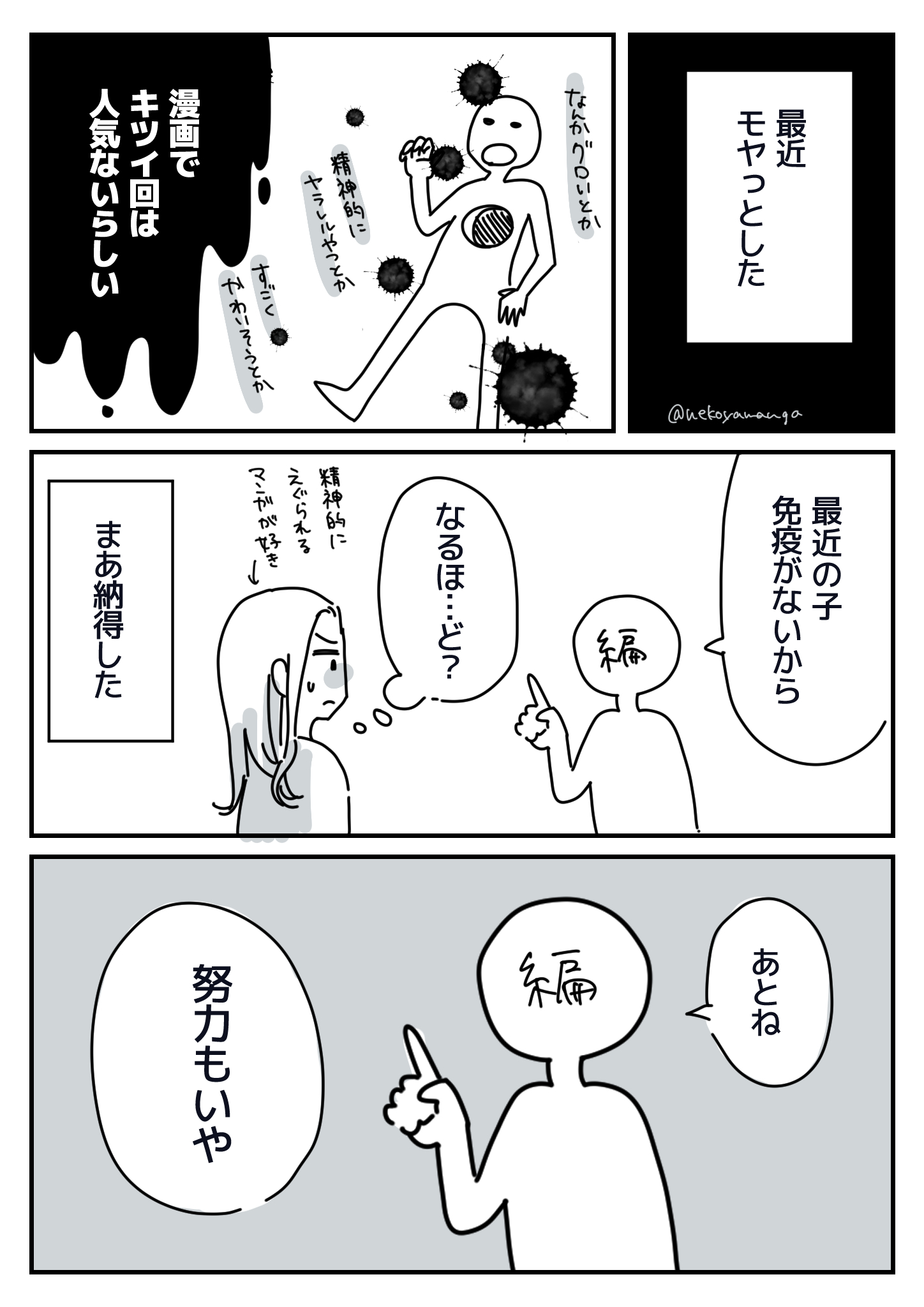 | … | 7525/12/21(日)20:43:04No.1384822510そうだねx2努力が嫌なんじゃなくて努力で進展してない話を見せられるのが嫌 |