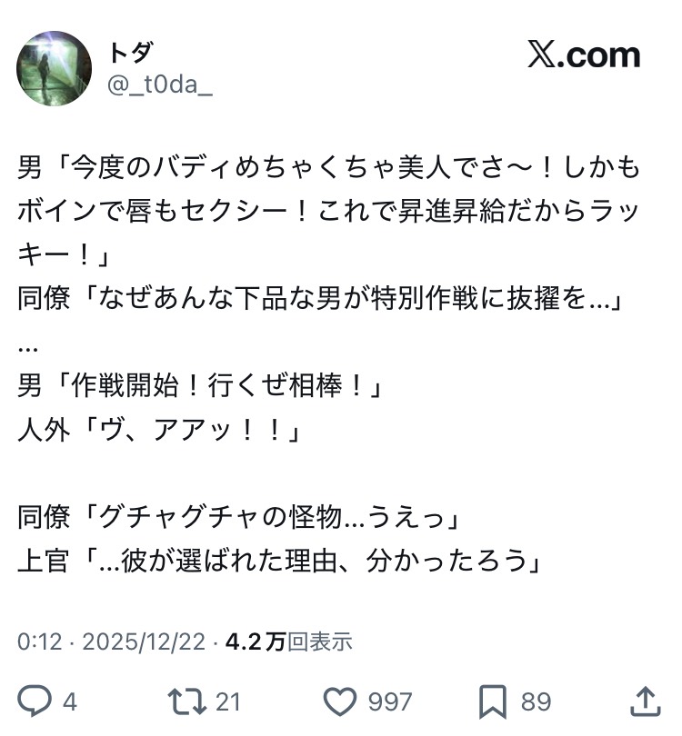 | … | 2925/12/22(月)03:09:45No.1384957017+同僚をスケベな視線で見てる男が人外の怪物をグチャグチャにしてるのかと思った |