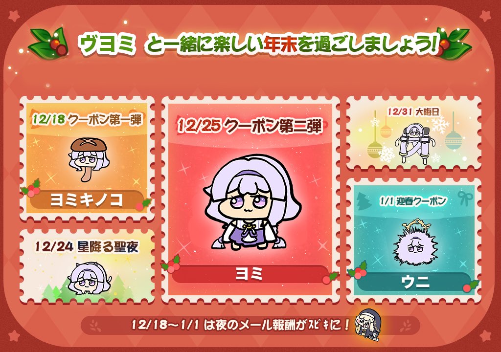 | … | 33025/12/22(月)19:08:39 ID:FleawgmANo.1385124541+ガチャチケはもう配ってるしスキンもアリスの報酬であるし他にクーポンコードで何もらえるのか気になるにゃ |