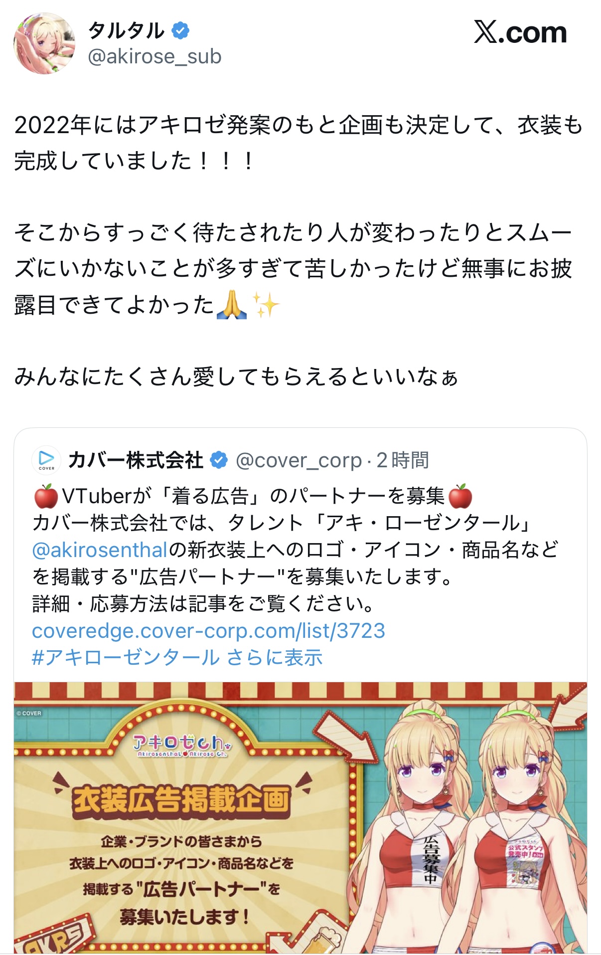 | … | 2025/12/23(火)00:06:30No.1385243967そうだねx15というかこれは企業タレントがスポンサー募って衣装で広告するっていうポイントが超えないといけないハードル多数あるのが分かりきってる訳だからしゃーなくね?としか思わん |