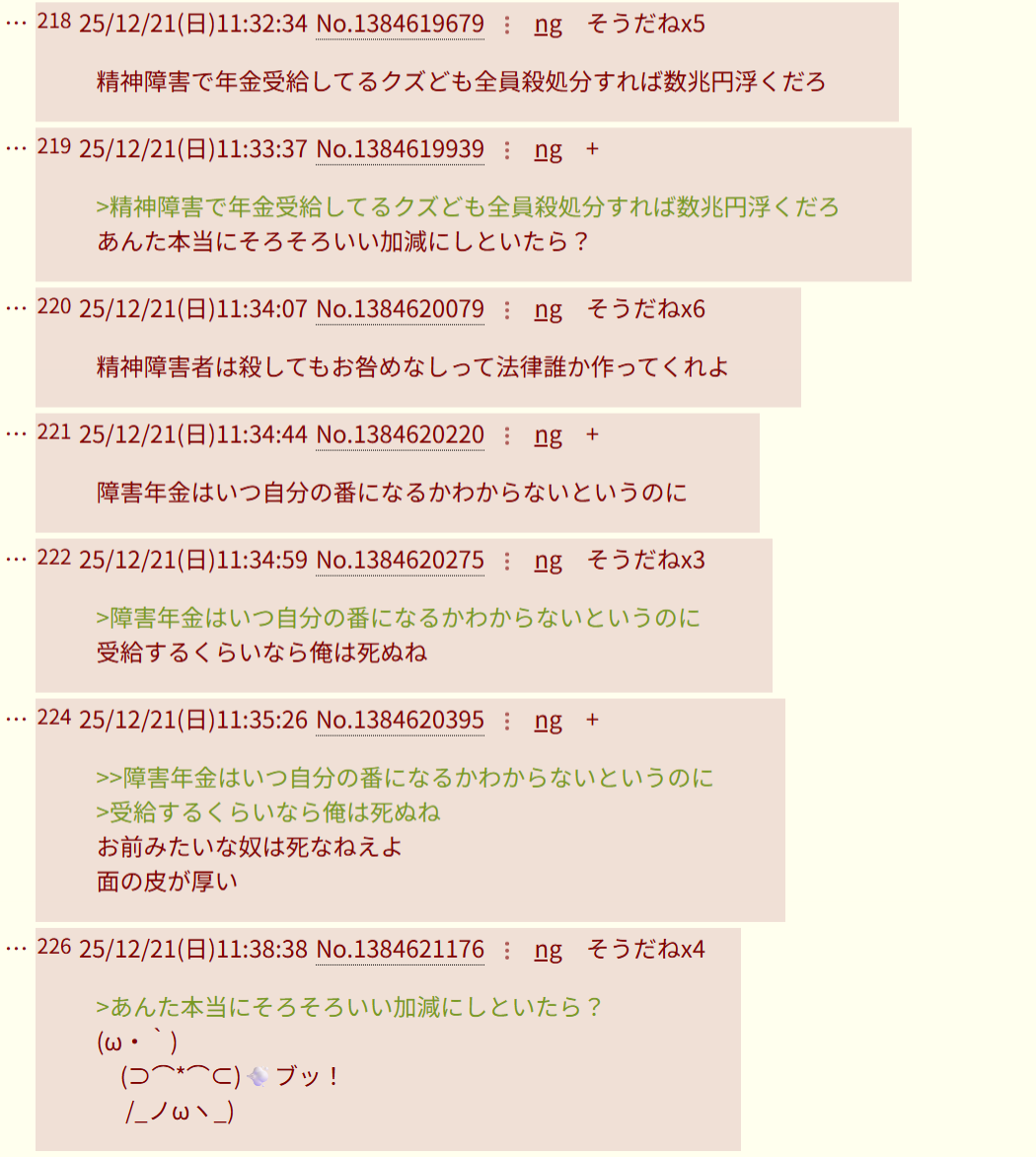 | … | 225/12/23(火)00:34:53No.1385253412そうだねx19まあここにいる荒らしみたいなのは死んだ方がいいと思うが |