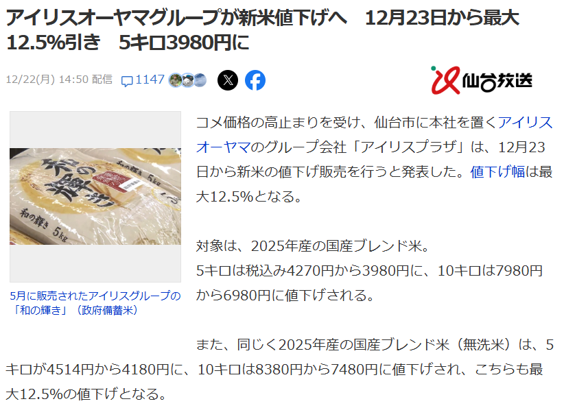 | … | 325/12/23(火)00:23:25No.1385249635+今でも25年度産国内単一ブランド米がスーパーで |