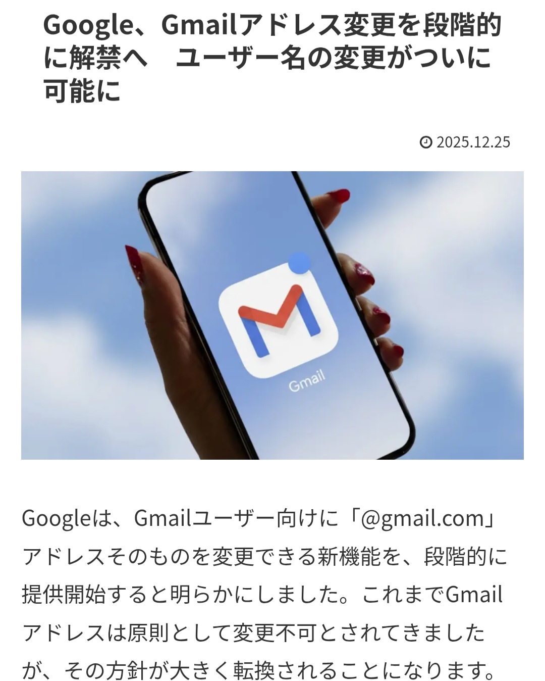 | … | 425/12/25(木)16:25:19No.1386034541+https://9to5google.com/2025/12/24/google-change-gmail-addresses/ |