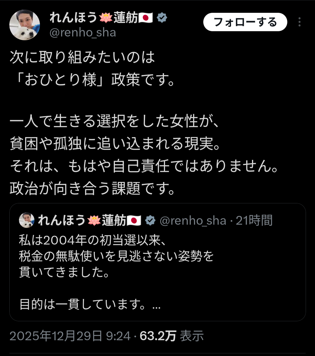 | … | 625/12/30(火)07:30:52No.1387631264そうだねx12おひとり様に割く税金って男女問わず無駄遣いじゃね |