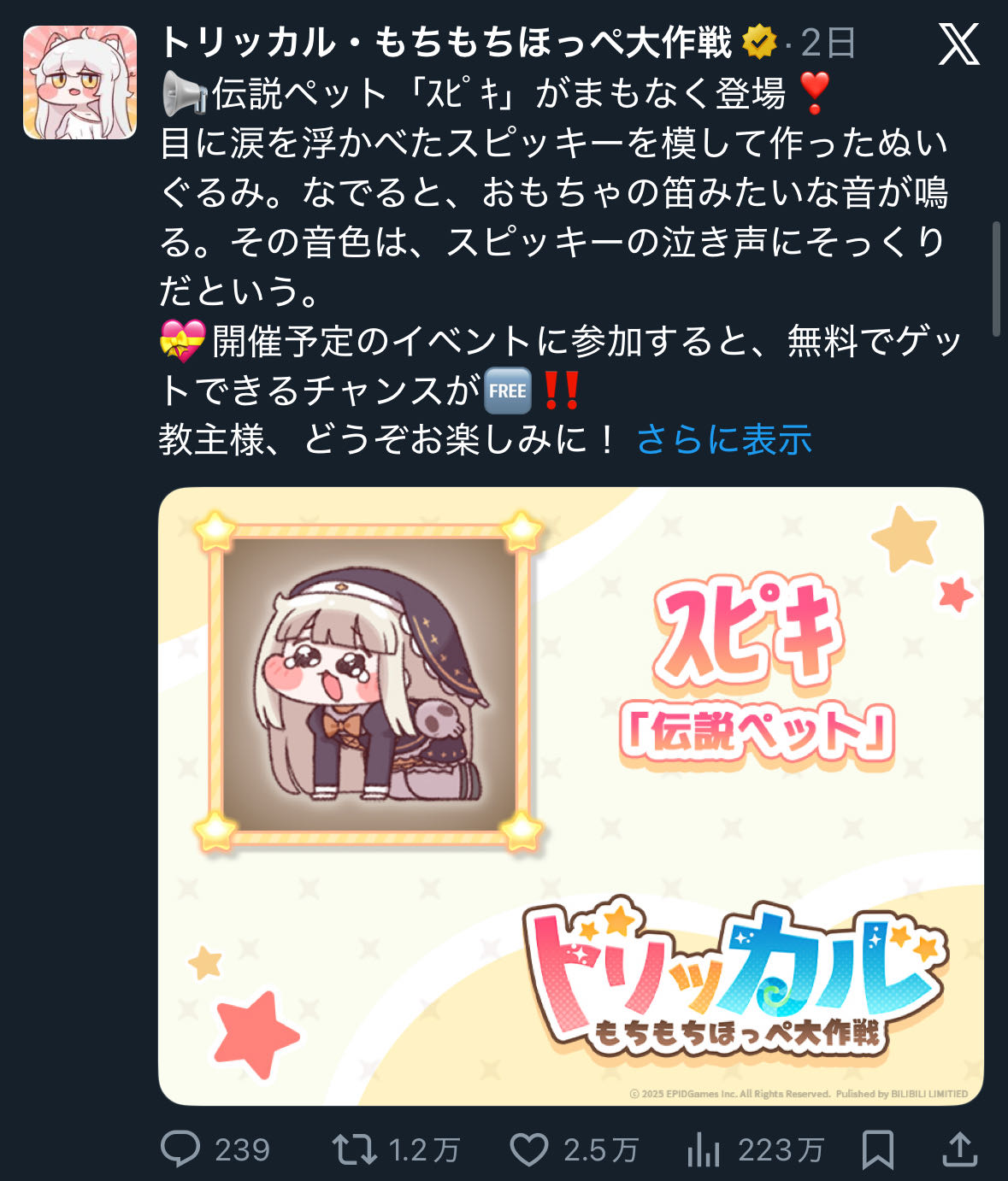 | … | 2425/12/30(火)10:48:20 ID:ParWb0JsNo.1387665746そうだねx1なんか本当にスピキをゲートウェイにしてそこそこトリッカルの世界観に触れてるつぶやきを見かけて怖いです… |