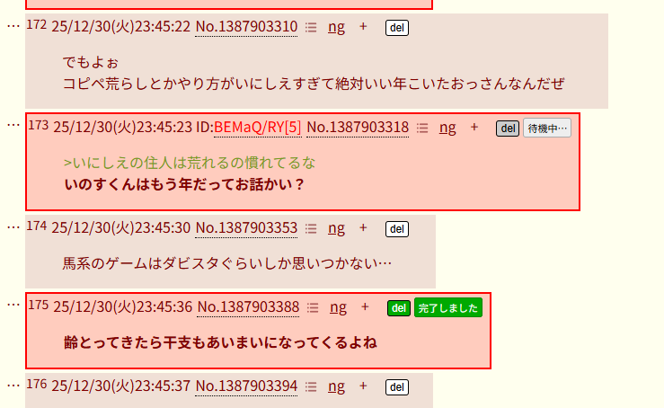| … | 25025/12/31(水)00:00:19No.1387908172+いのすくんの古参アピールで弄りすぎてコラッ!ってされた「」が直後に荒らしっぽいムーブ始めた事もあったしその辺の「」かなぁ |