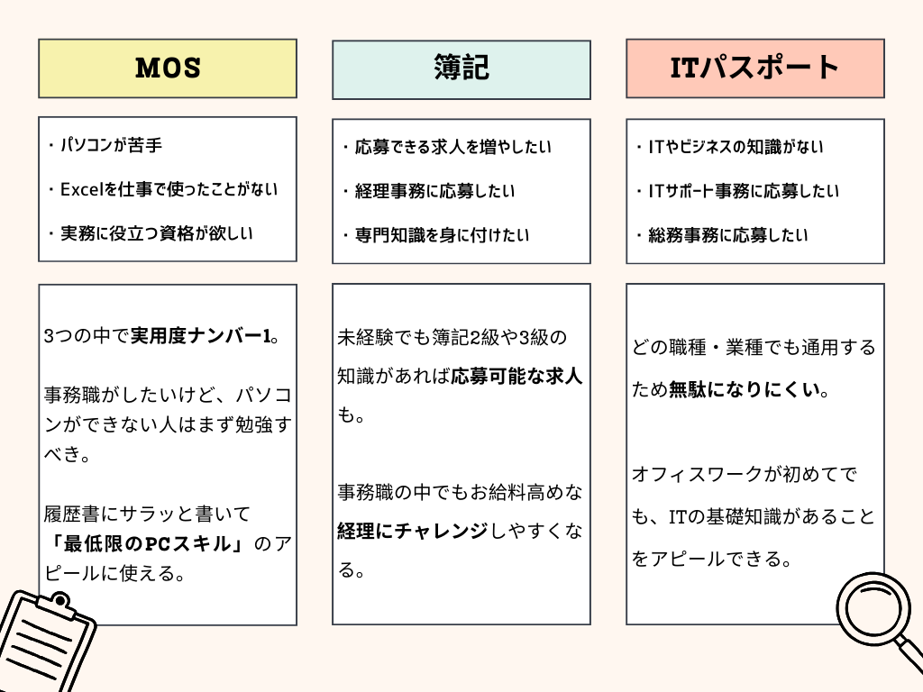 | … | 6725/12/31(水)12:53:03No.1388031435+>MOSやITパスポートは仕事道具を上手く使えるか?って図る資格だけど簿記はそれそのものが仕事になりえるからだいぶ違わない? |