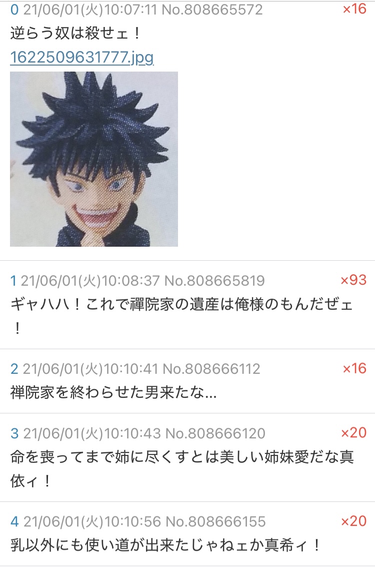 | … | 7525/12/31(水)19:11:58No.1388138371+>いや伏黒の術式が扇の術式より伝統あるなんて分からなくね |