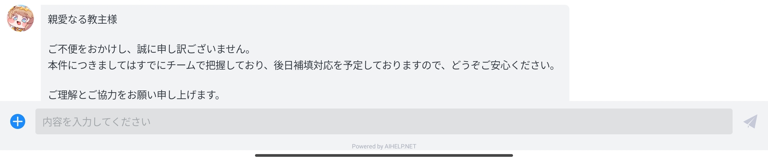 | … | 45126/01/02(金)19:25:28 ID:gDxP494.No.1388841489そうだねx1本件につきましてはすでにチームで把握しており、後日補填対応を予定しておりますので、どうぞご安心ください! |