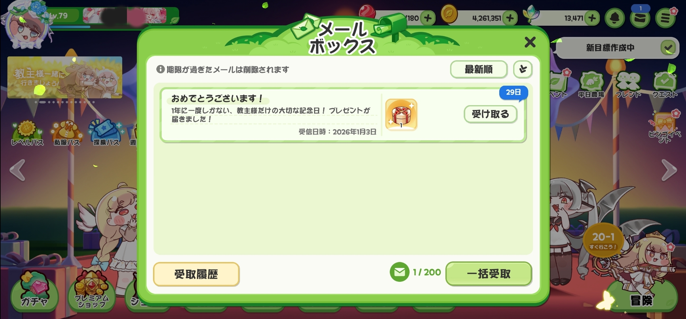 | … | 30126/01/03(土)00:54:38 ID:1mMUQ2D6No.1388965354+やたらと配ってくれたおかげで簡単に使徒募集200回到達したにゃん |