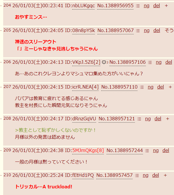 | … | 2326/01/02(金)23:45:03 ID:Ve7tdl8MNo.1388944576+>>年末年始はなんかレスバトラーが多いにゃ… |