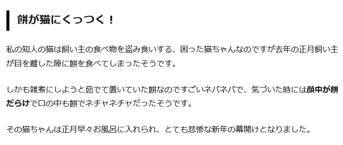 | … | 2326/01/03(土)14:44:39No.1389092840+猫に餅を与えるときは必ず小さく切り分けるように |