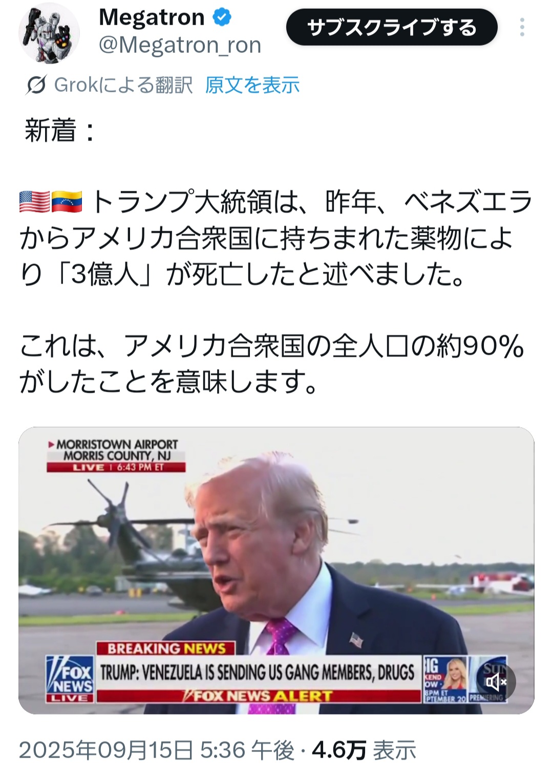| … | 9026/01/03(土)17:36:25No.1389135646そうだねx1これでノーベル平和賞欲しがってるとかマジ?! |