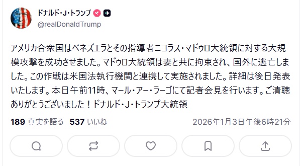 | … | 96026/01/03(土)18:48:30No.1389155474+>戦争中でもない他国を爆撃して元首を拉致っていい法律なんて世界中探してもどこにも無いと思う… |