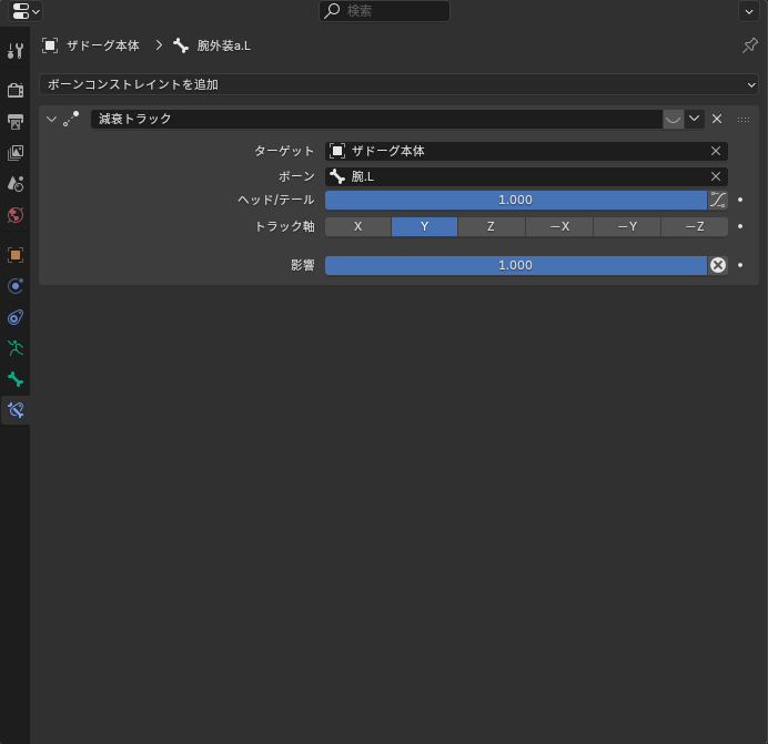 | … | 1026/01/03(土)20:16:24No.1389186399そうだねx2この動きを実現させるのはボーンコンストレイントを使います |