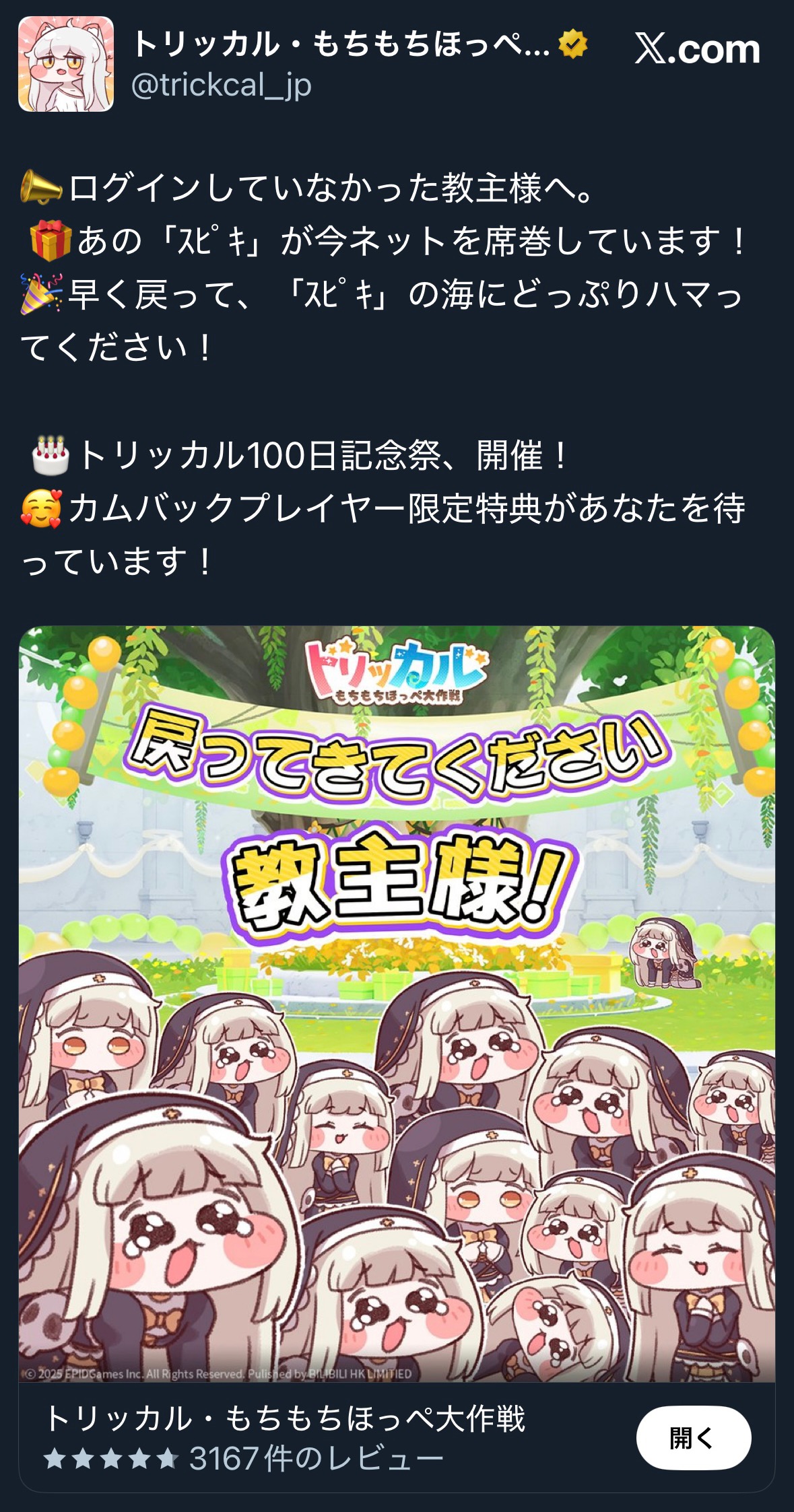 | … | 7726/01/04(日)00:43:07 ID:Q8UybmJ2No.1389287645そうだねx1>こういうソシャゲでプレイヤーがログインしない=作中にもいない形式になってるの初めて見たけど |
