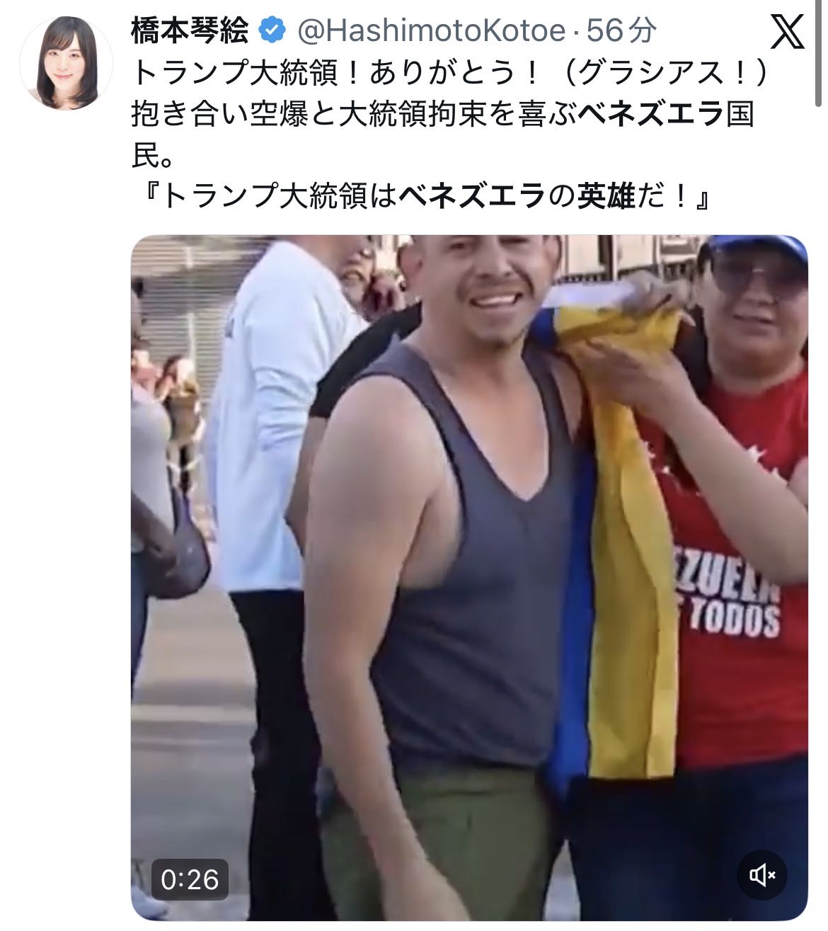 | … | 92726/01/04(日)07:26:58No.1389328845そうだねx2ベネズエラ国民は喜んでいますって字面だけだとだいぶ大本営発表だな… |