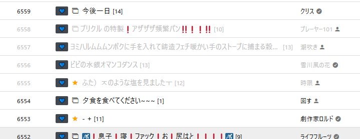 | … | 4726/01/05(月)01:49:54 ID:PbhAB.GANo.1389626105+ダメ |