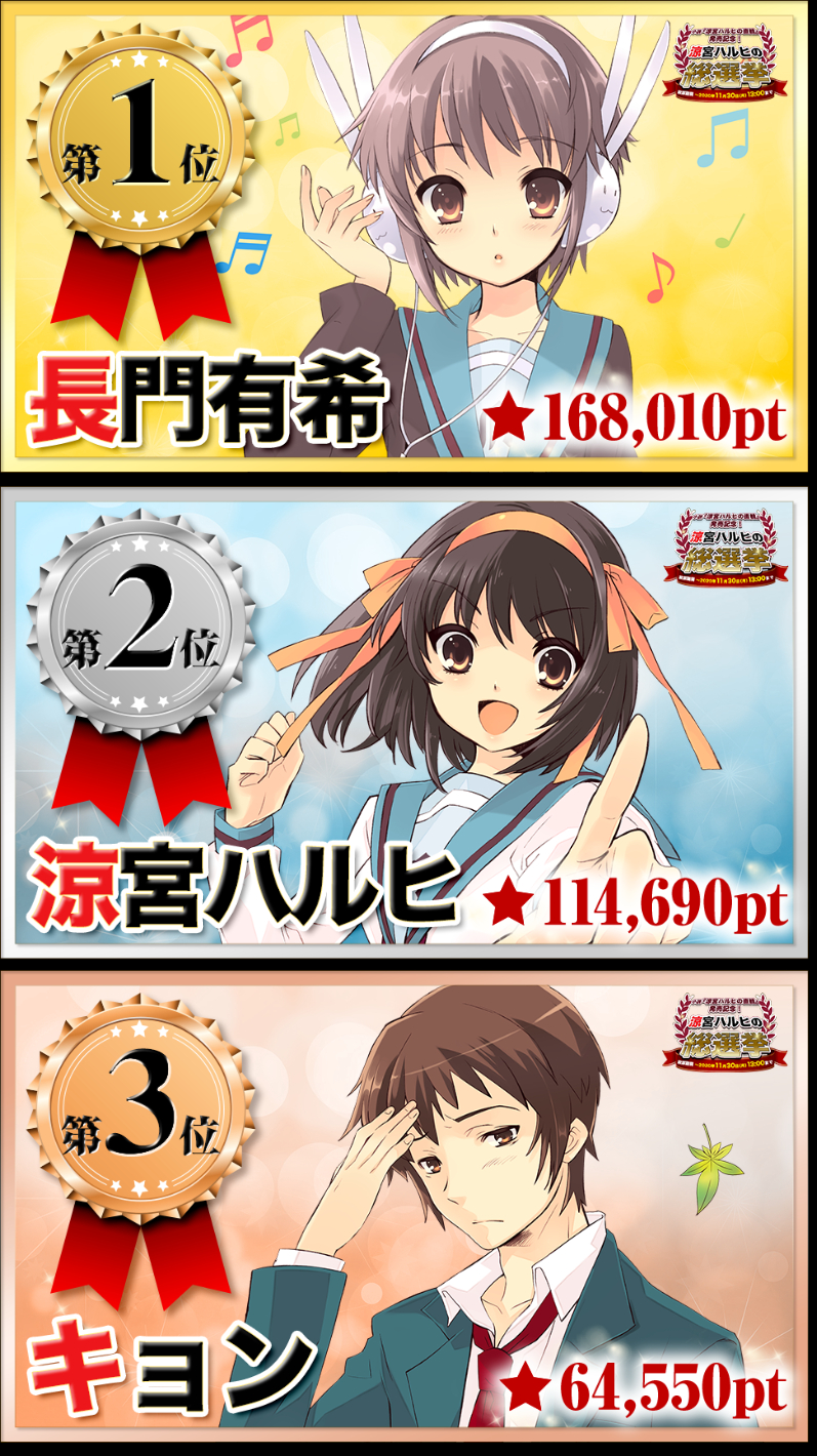 | … | 5426/01/05(月)15:00:26No.1389714501+上の大選挙だとハルヒ2位なんだな |