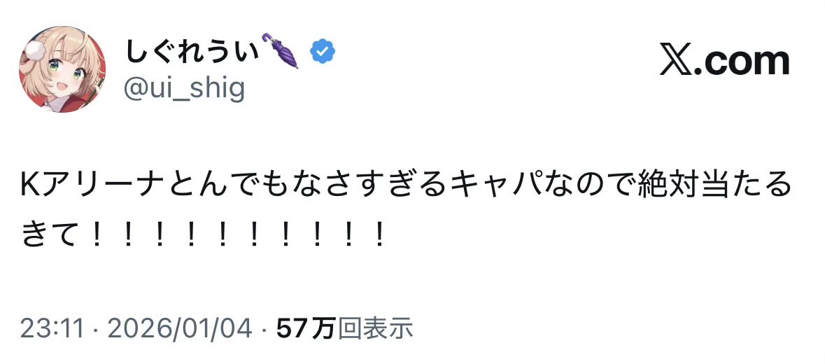 | … | 5526/01/05(月)18:11:03No.1389754916+Kアリーナはなんかちょうどいいサイズで有名と聞く |