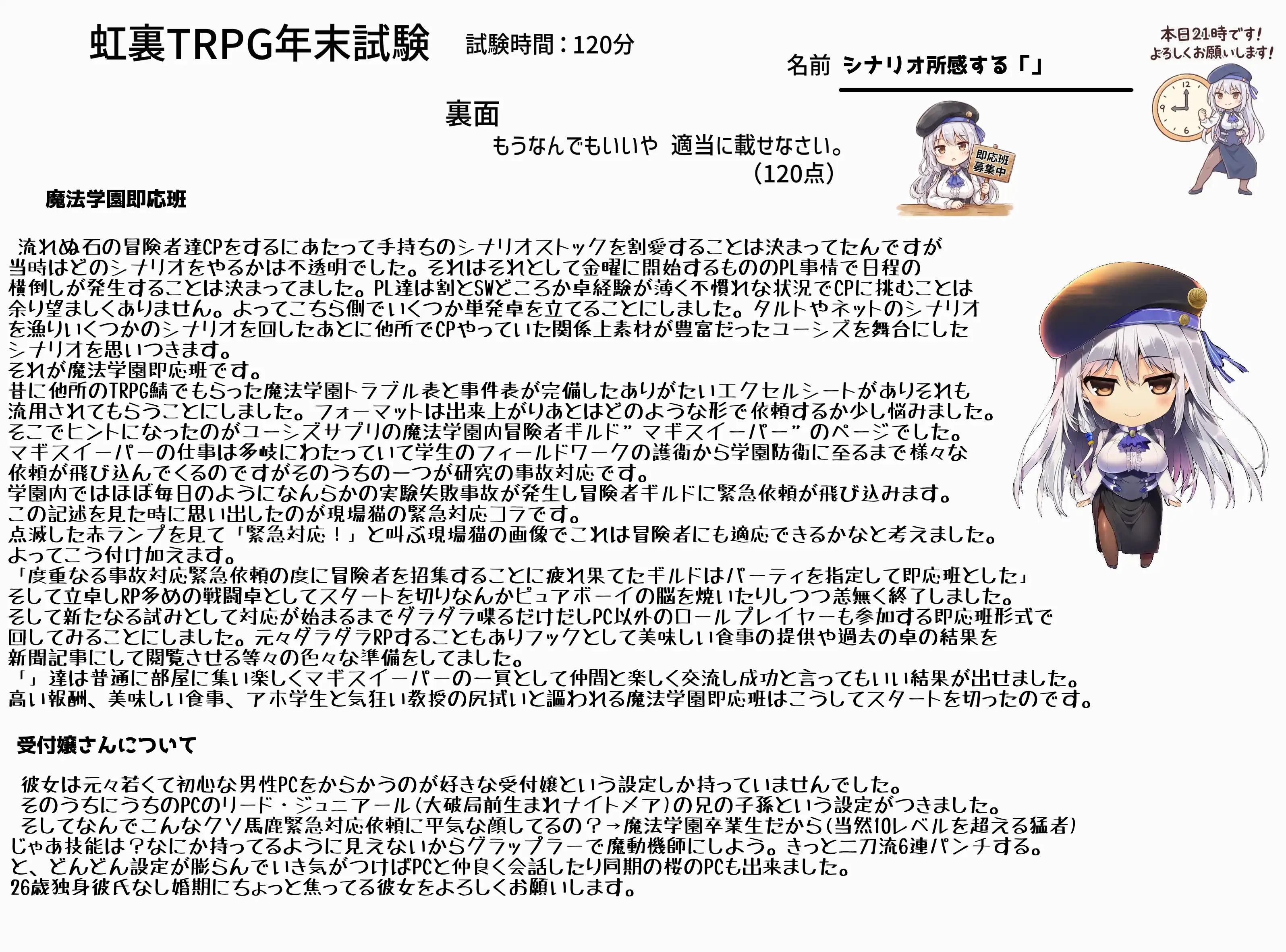 | … | 4626/01/06(火)19:49:01No.1390070955+自分が作ったシナリオ以外はPLで遊ぶ可能性を視野に入れて自作シナリオを作る |