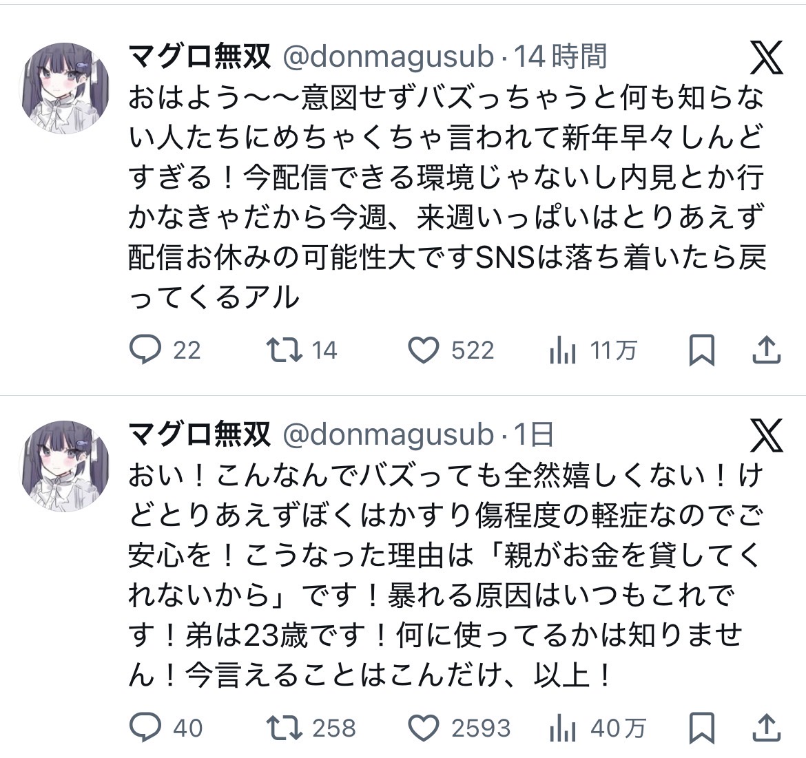 | … | 126/01/06(火)22:17:05No.1390122718+配信してる場合じゃねえ |