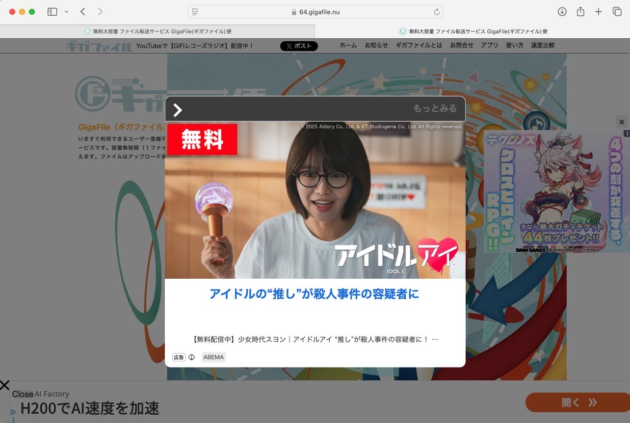 | … | 2626/01/07(水)11:54:51No.1390231712+ギガファイル便のこのポップアップはまあ自分はなんとかなるけど |