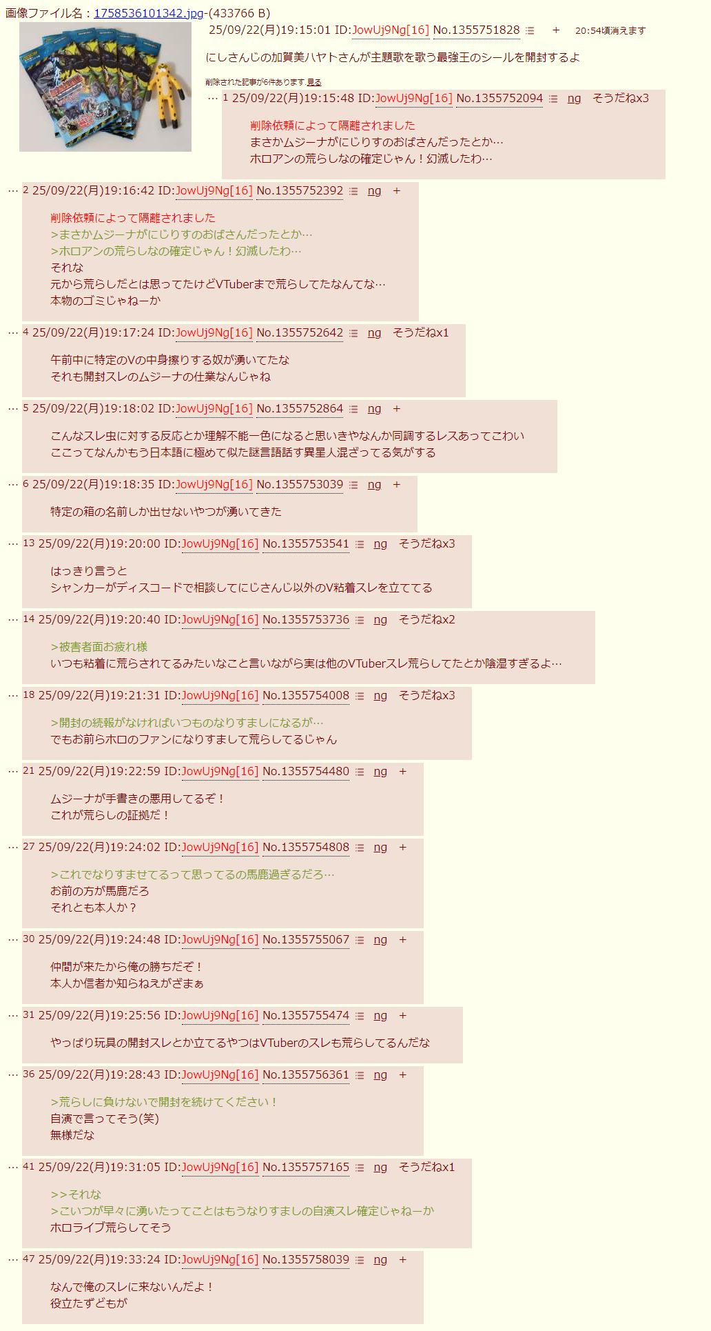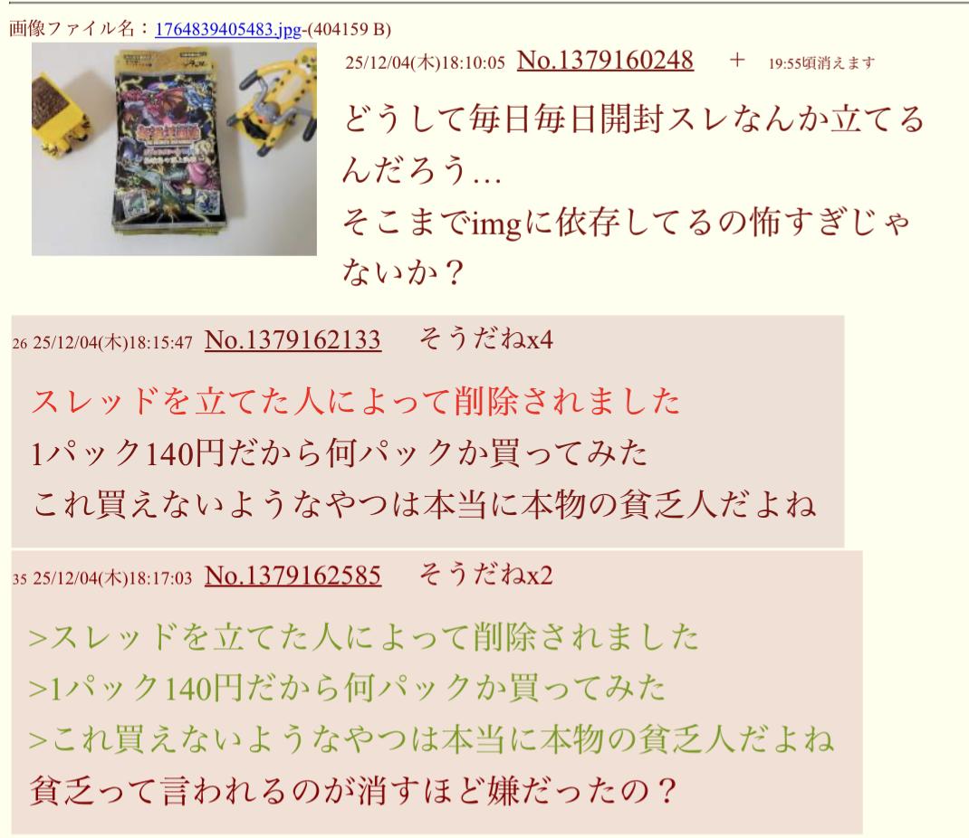 | … | 6126/01/07(水)19:09:33No.1390331521+本気で疑問なんだけどなんでおもちゃ開封してるだけのスレにそんなキレ散らかしてんの…? |