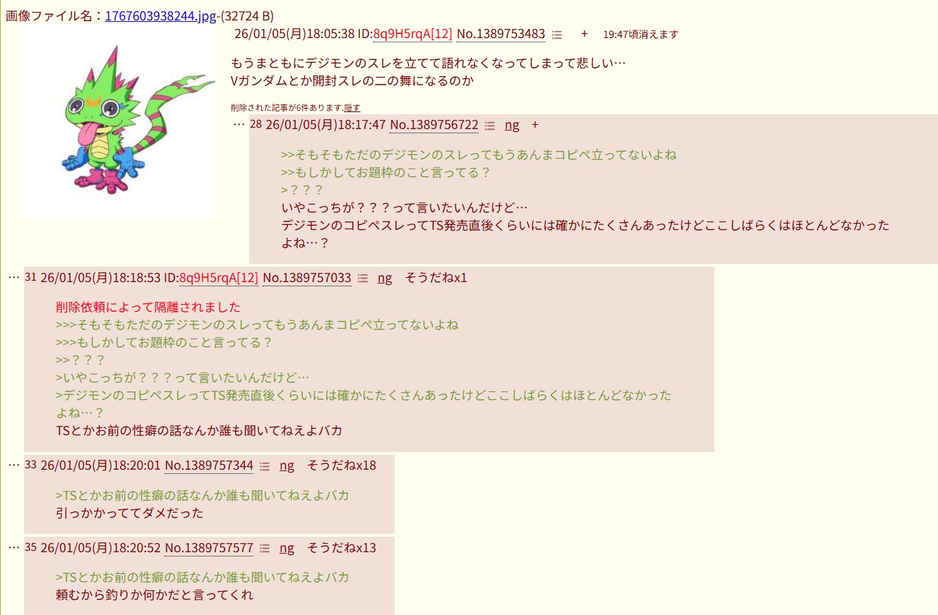 | … | 4026/01/07(水)19:05:49No.1390330167そうだねx1>>口汚いゴミが語ってんなよ雑魚 |