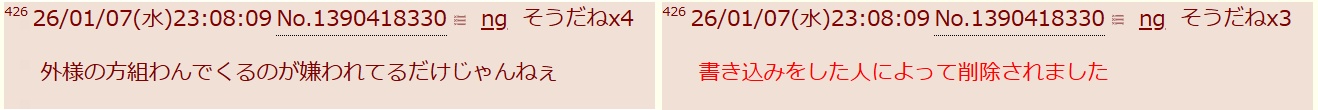 | … | 42626/01/07(水)23:08:09No.1390418330そうだねx3書き込みをした人によって削除されました |