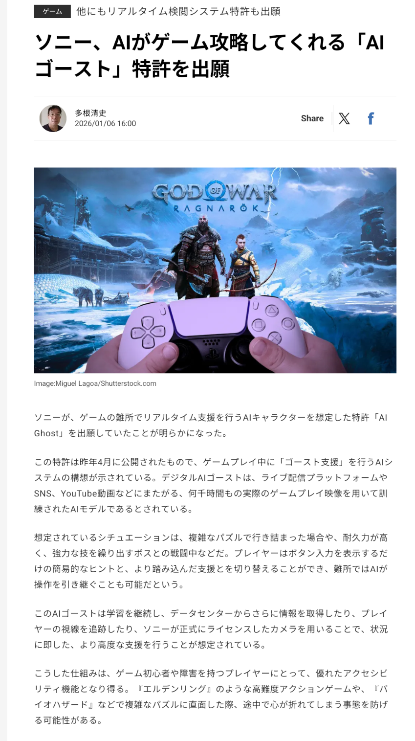 ソニー、AIがゲーム攻略してくれる「AIゴースト」特許で任天堂を置き去りにする