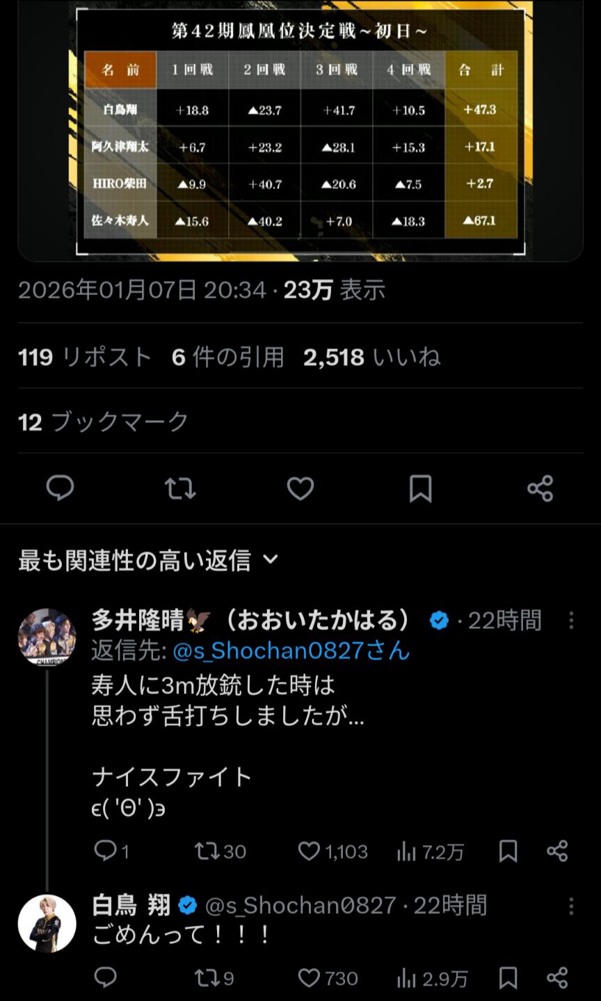 | … | 126/01/08(木)19:00:24No.1390618216そうだねx3🀄麻雀ch🀄 |