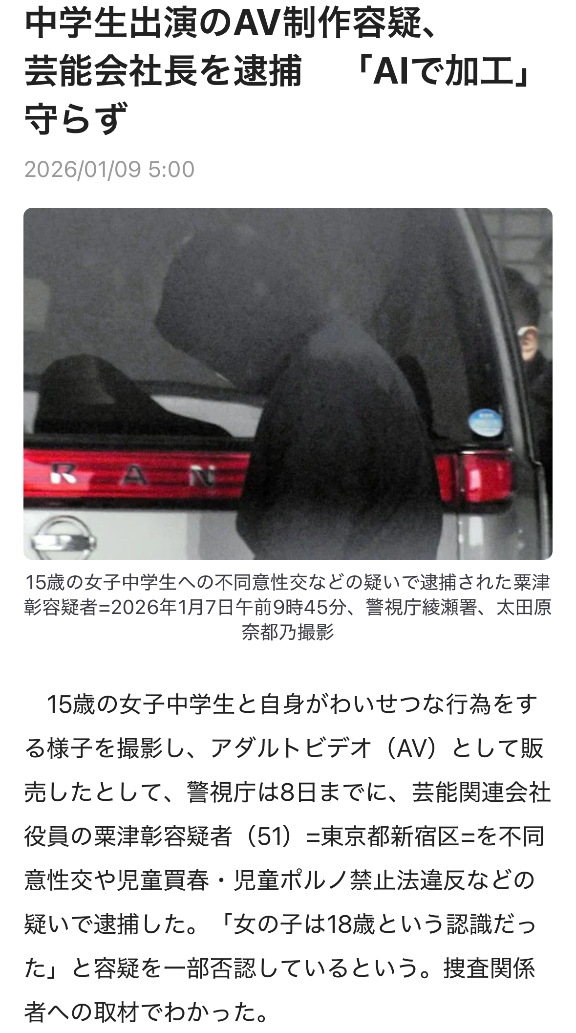 | … | 1226/01/09(金)07:17:52No.1390761740+粟津容疑者は、出演契約の書面などを渡さずにAVを制作したとするAV出演被害防止・救済法違反の疑いでも逮捕された。捜査関係者によると、「顔はAIで加工する」と伝えて撮影していたが、実際には加工はわずかで個人が特定できるような状態だったという。容疑者自身は顔を隠した上で、女子中学生の相手役として出演していた。 |