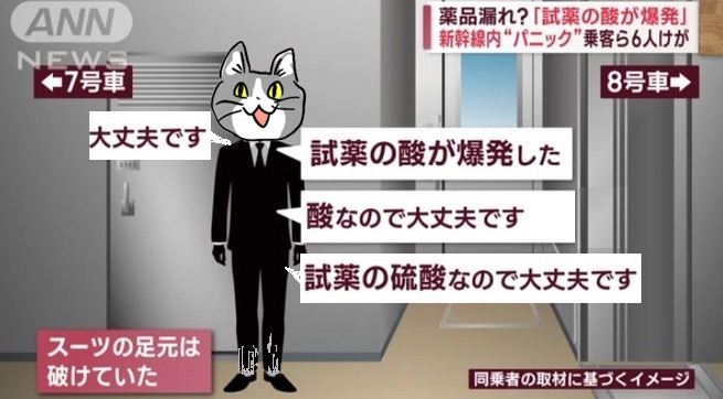 | … | 6826/01/09(金)13:45:22No.1390825477そうだねx3>ほかの乗客が乗務員を呼びにいく間、この男性は「試薬の酸が爆発してしまった」と話し、「危ないものではないです。試薬の硫酸なので大丈夫です」「ご迷惑をおかけしてすみません。大丈夫なので」などと繰り返していたという。 |