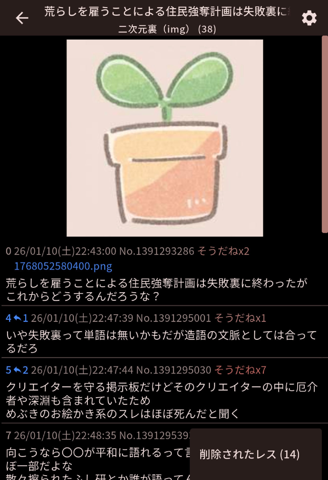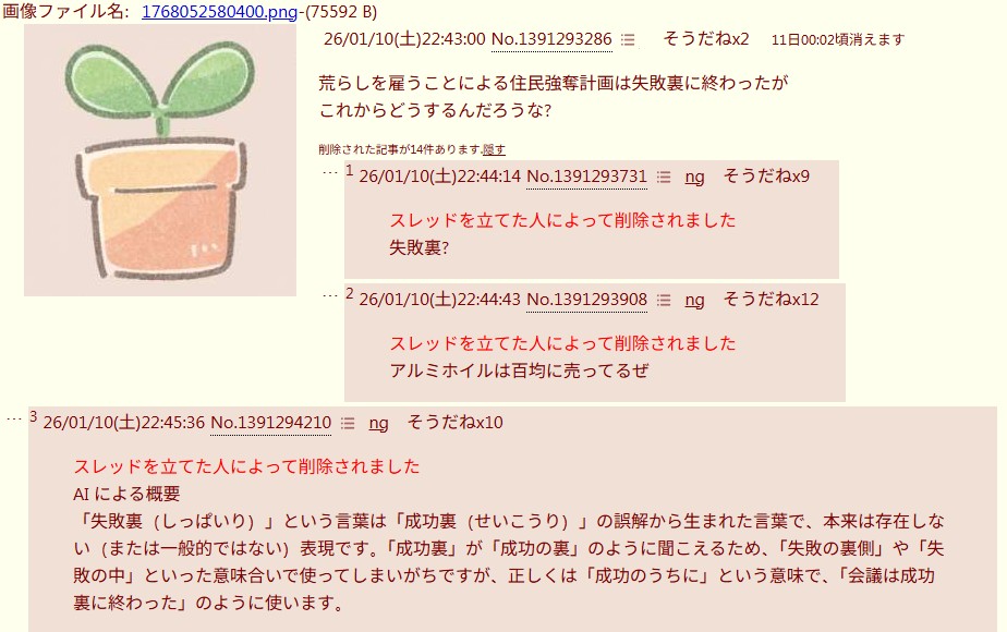 | … | 2626/01/10(土)23:03:49No.1391301298そうだねx5めぶき叩きスレ日本語の指摘以外は普通にノリノリでスレ「」に同調して伸びてたのにそれでも爆破するのプライド高すぎない? |