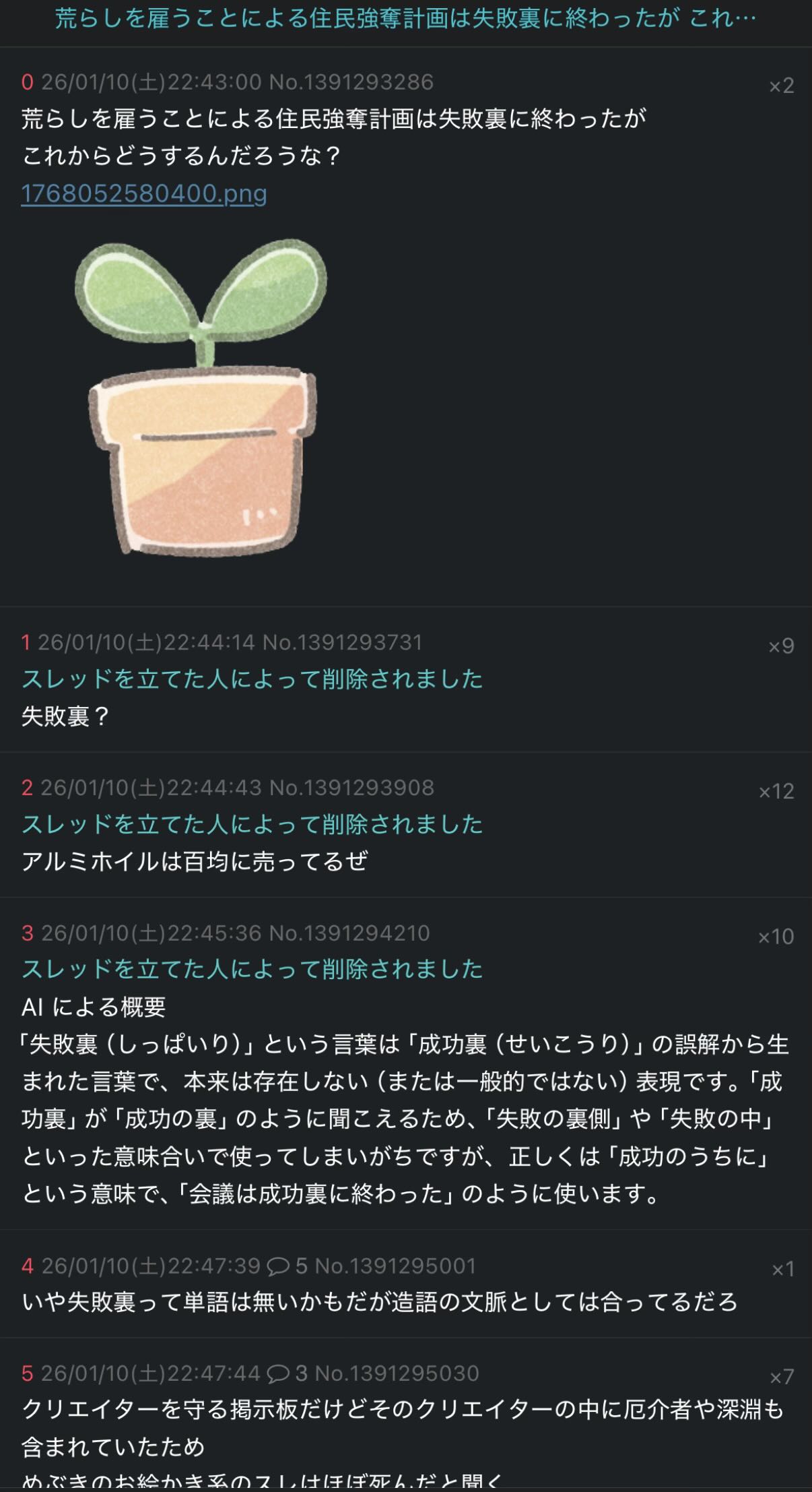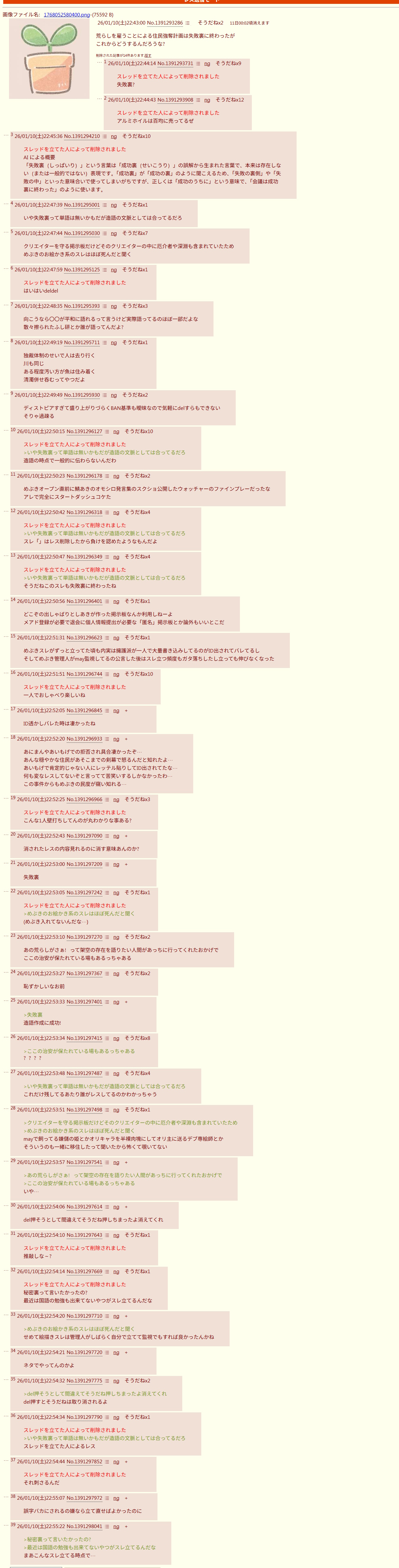 | … | 526/01/10(土)22:59:19No.1391299508そうだねx6消したスレは失敗裏に終わったね |