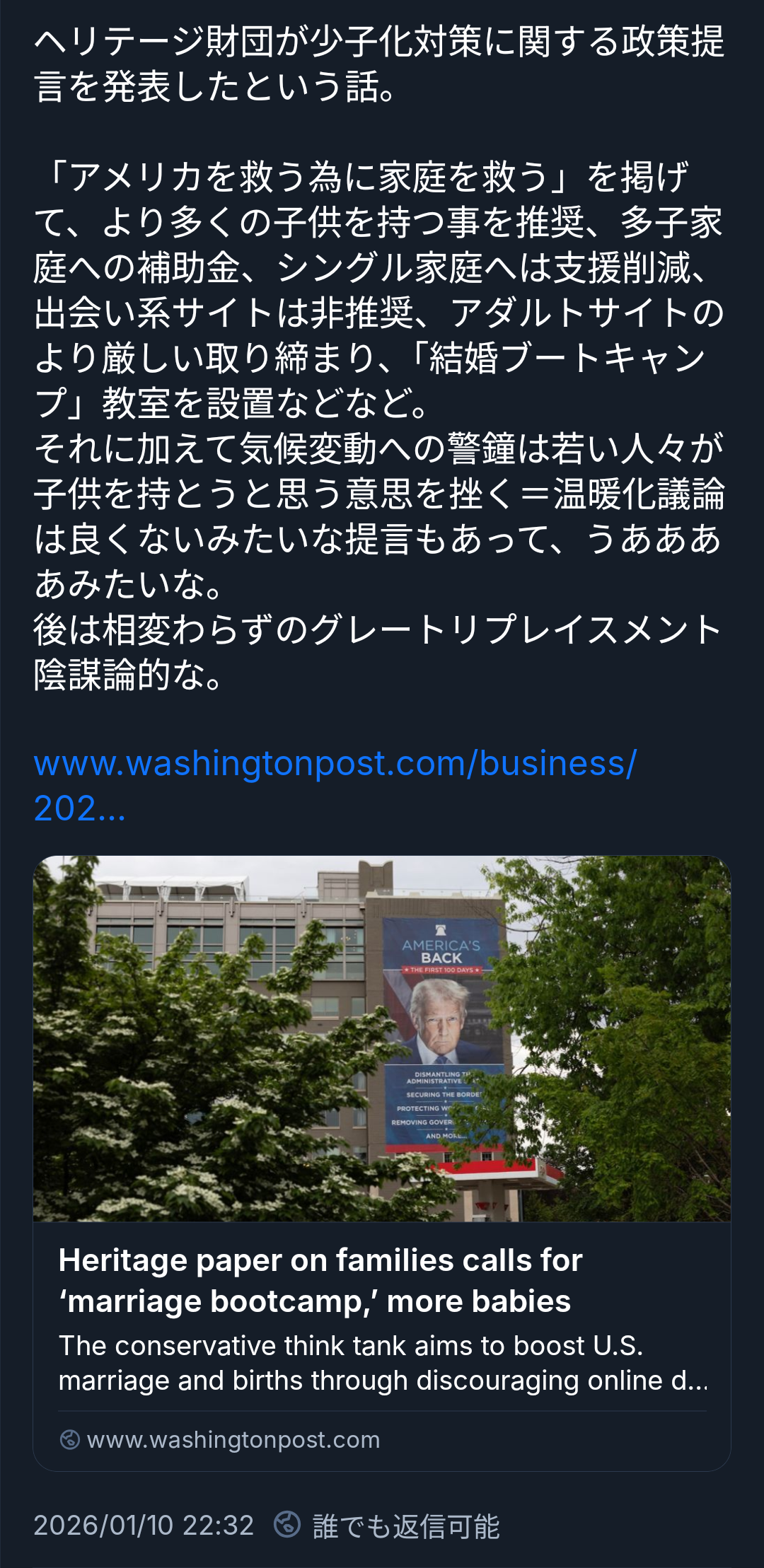 | … | 7026/01/11(日)20:51:43No.1391605085+キリスト教価値観と古き良き白人社会への回帰願望が強すぎて各国の少子化対策の中でも特に歪みが凄まじいと思う |