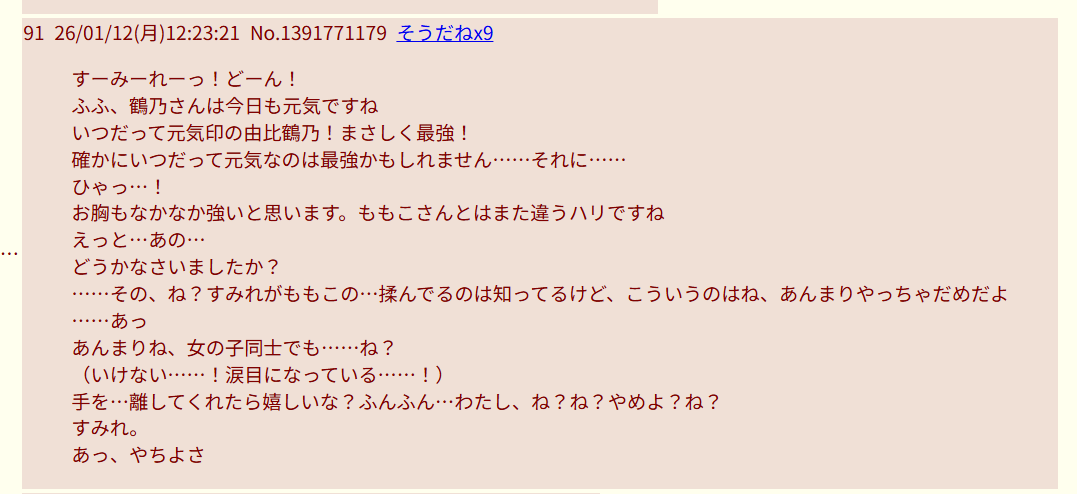 | … | 27826/01/13(火)13:56:13No.1392099503+>昨日見たおっぱい揉まれて泣き出しちゃうゥッ鶴乃は正直滅茶苦茶興奮したグル |