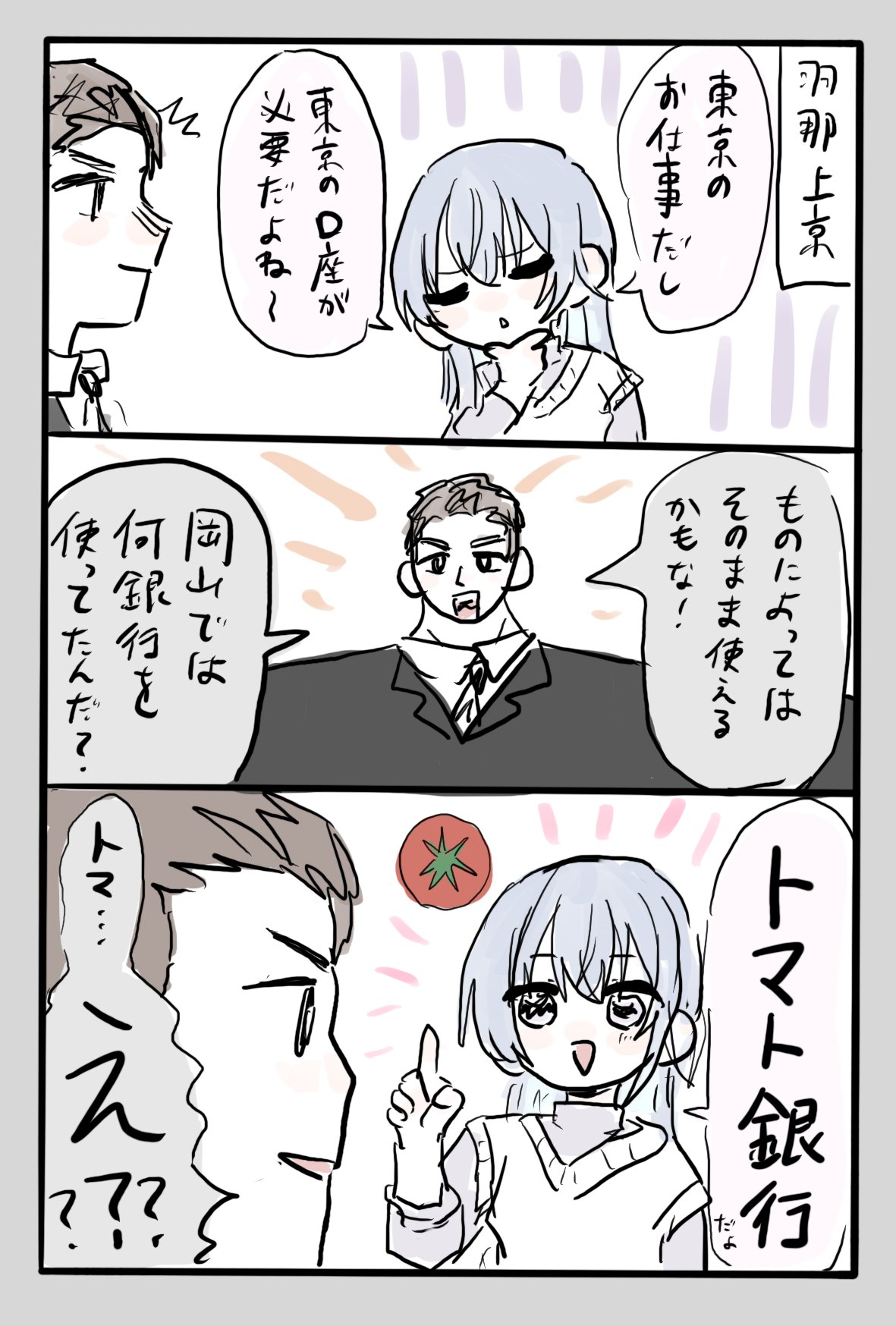 | … | 8626/01/13(火)14:19:39No.1392104005+>会社でトマト銀行と付き合いあるけど大体「トマ銀さん」か「トマトさん」って呼ぶよ |