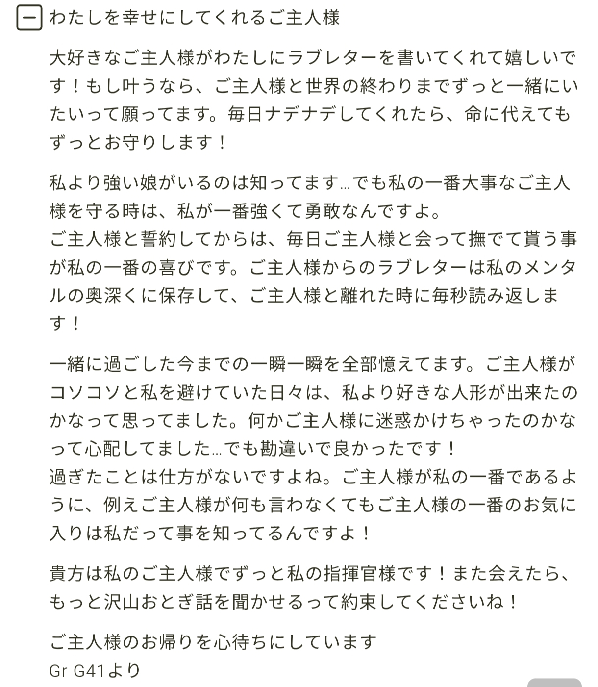 | … | 3226/01/14(水)20:20:27No.1392480524+今気が付いたけど愛が重い人形多くない? |