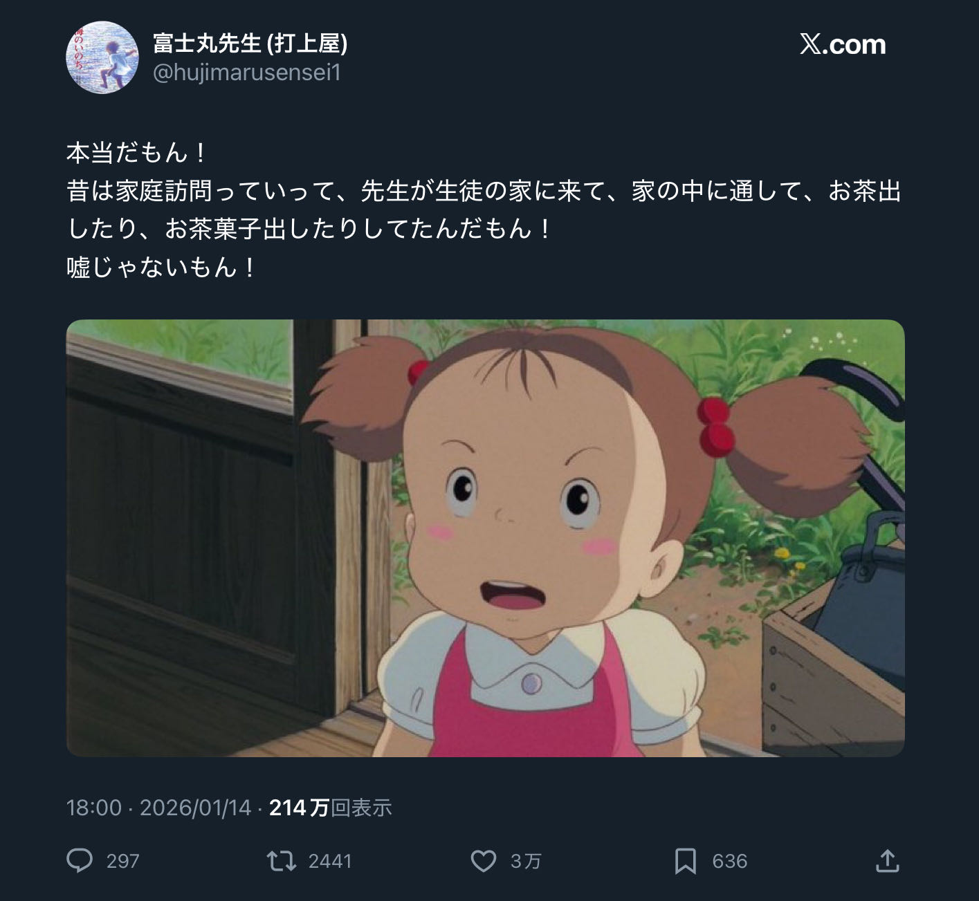 | … | 8426/01/14(水)22:23:27No.1392525951+ドラマやアニメでそういうシーンあるから家にも先生来るかなってワクワクしてたら地元じゃやらなかったみたいで悲しかった |