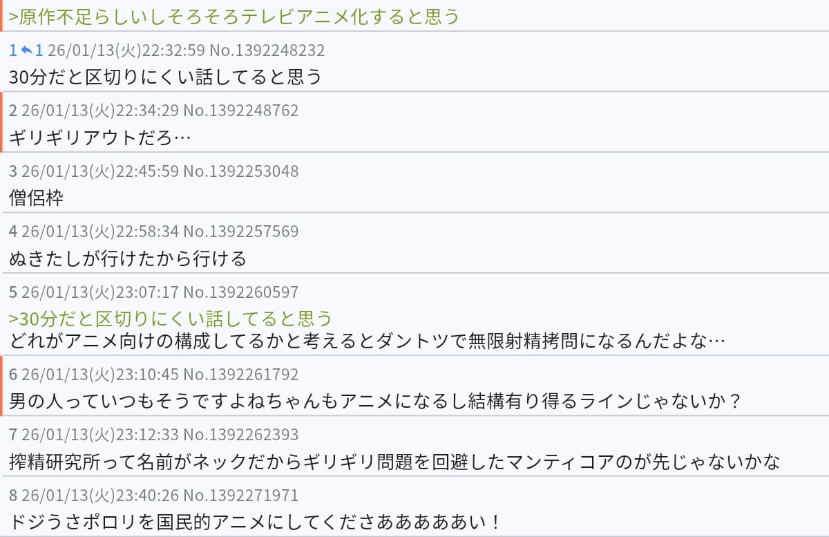 | … | 7326/01/15(木)18:23:07No.1392721231そうだねx5>原作不足らしいしそろそろテレビアニメ化すると思う |