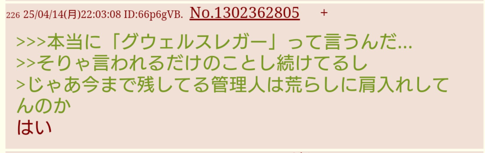 | … | 19226/01/15(木)20:12:04No.1392755158そうだねx3ふたばをログ残らないサイト扱いする程度の脳だからな… |