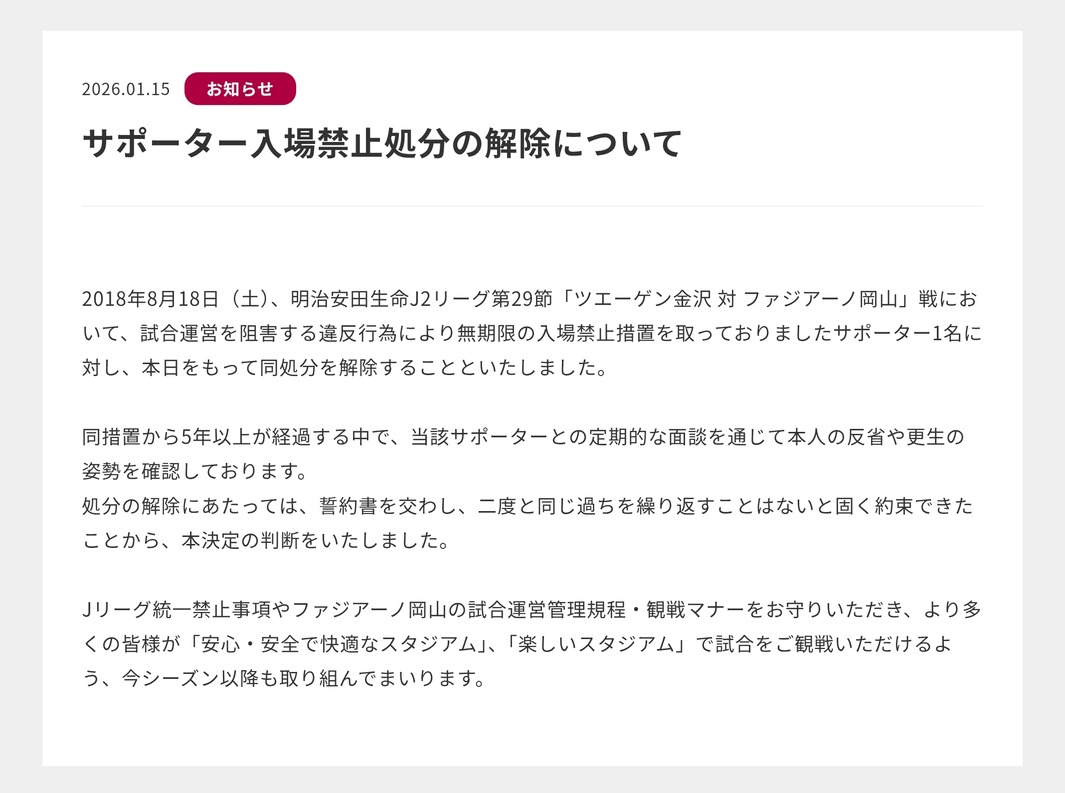| … | 2926/01/16(金)10:50:01No.1392910165そうだねx2>2018年8月18日(土)にアウェイで開催された明治安田生命J2リーグ第29節 ツエーゲン金沢戦で、ツエーゲン金沢の定める禁止行為違反がございました。 |