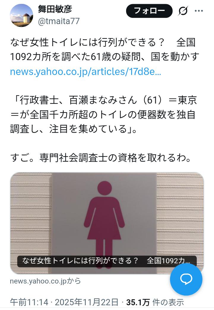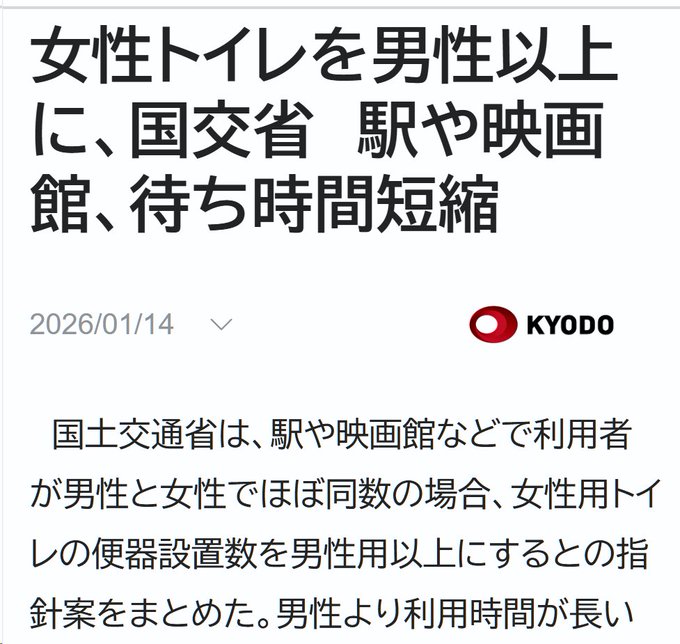 | … | 3326/01/18(日)09:57:02No.1393556463そうだねx16単に女子トイレ増やしてほしいじゃなくてなぜか男子トイレから奪うのが前提なんだよな |
