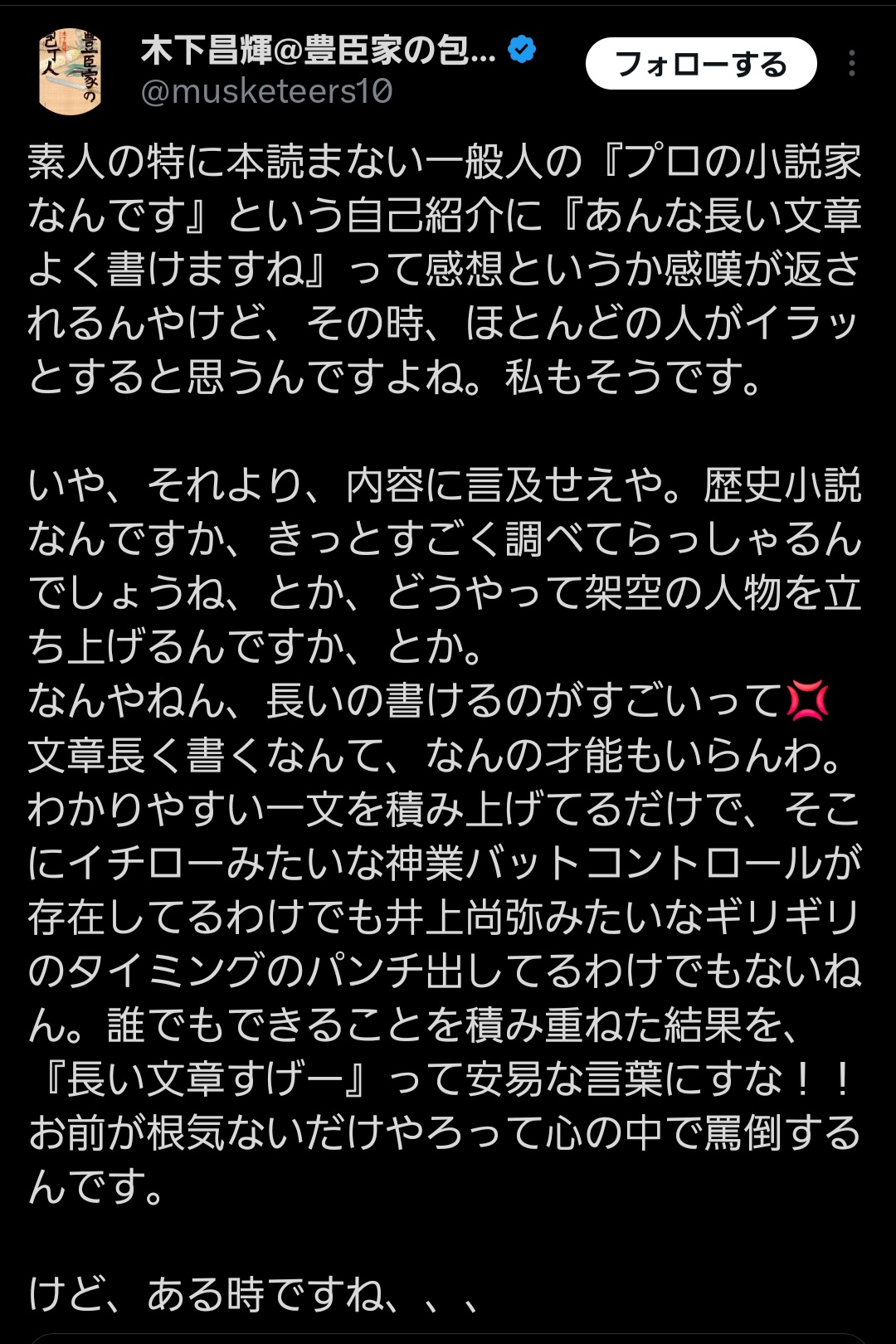 | … | 21126/01/19(月)07:51:51No.1393896689+>本をあまり読まない一般の方から、私の「プロの小説家である」という自己紹介に対して「あんな長い文章、よく書けますね」という感想をいただくことがあります。 |